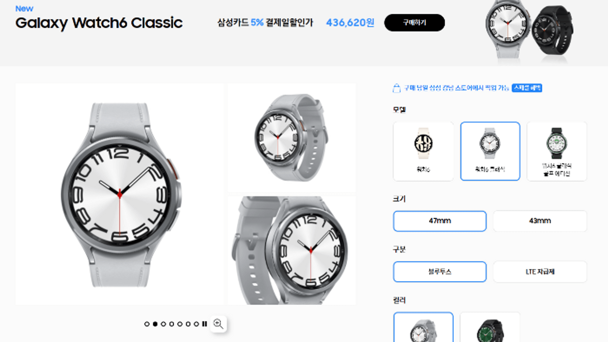 갤럭시 워치 5 출시 당시 새롭게 나왔던 프로 모델이 없어지고, 다시 클래식 모델을 반영한 부분이 눈여겨볼 만합니다. 갤럭시 워치 6 크기는 전작과 동일하게 40mm, 44mm 두 가지로 나왔으며, 클래식은 43mm, 47mm로 워치 4보다 1mm 커졌습니다.