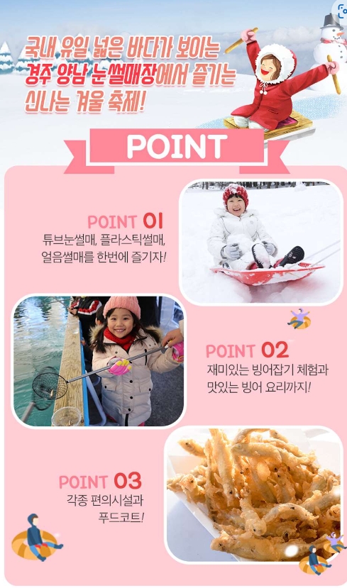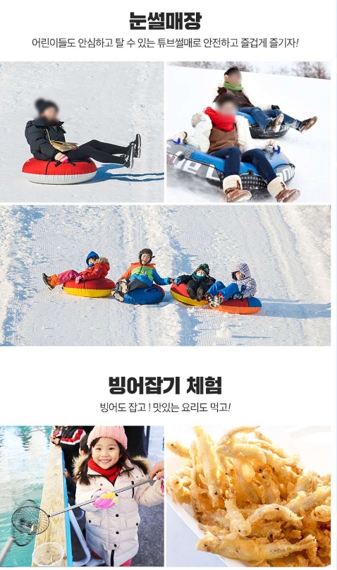 - 이용금액 : 눈썰매 1인권 15,000원(네이버예매 13,900원) / 눈썰매+빙어잡기 1인권 20,000원(네이버예매18,900원)