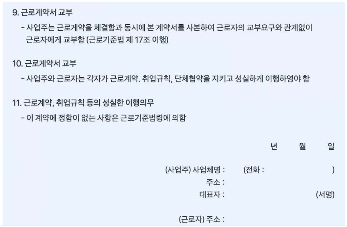 이 내용을 토대로 근로계약서에 반드시 포함해야 할 내용을 정리해 보겠습니다.