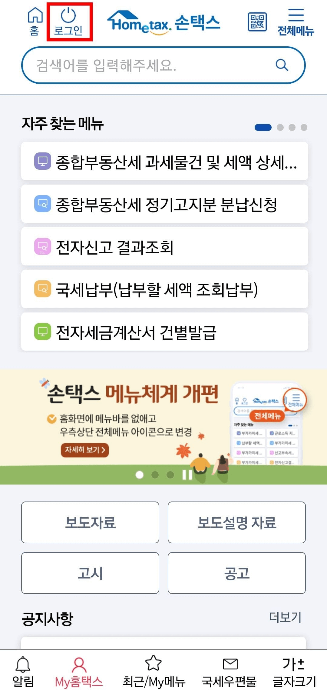1. 국세청 홈텍스 홈페이지에 접속합니다. 로그인 후 맨 위 [MY홈택스]로 이동합니다.
