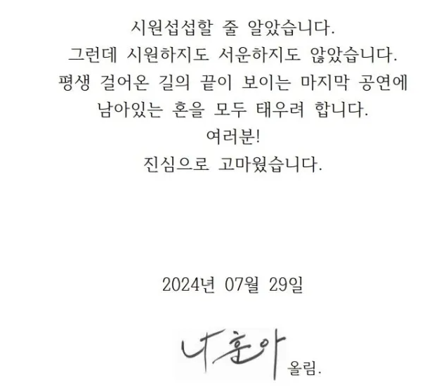 팬 여러분의 많은 관심과 참여를 부탁드립니다. 2024 나훈아 콘서트는 여러분과 나훈아가 함께한 생애 마지막 순간이 될 것이니, 잊지 못할 소중한 추억을 그려보시길 바랍니다.