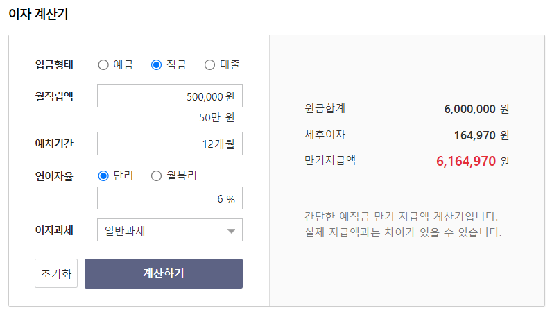 본인이 직접 계산해 보고 싶으시다면 이자 계산기를 통해 계산해 보시기 바랍니다.