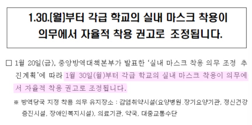 2023년 1월 30일부터 방역당국이 지정한 마스크 착용 의무 유지장소를 제외한 대부분의 실내에서 마스크착용 의무가 해제됩니다. 코로나19로 인해 지난 2020년 10월 도입된 마스크 착용 의무가 27개월여만입니다.