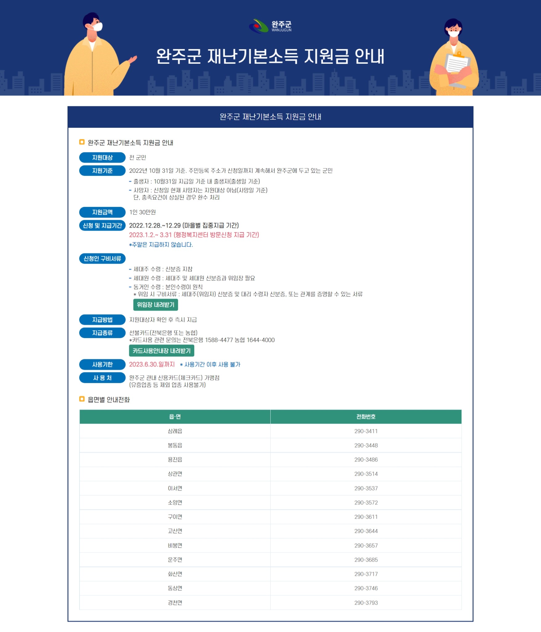 2022년 12월 말부터 완주군은 재난기본소득 지원금을 전 군민에게 지급하는데 이번지원은 코로나19 장기여파와 지역 침체 군민들의 경제적, 정신적 어려움을 겪고 있다는 판단에 따라 이루어졌다고 합니다.