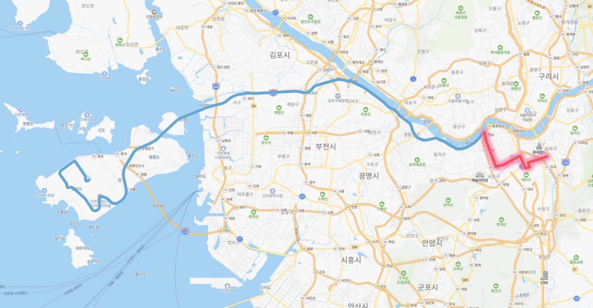 빨간색 선은 버스가 정차하는 구역, 파란색 선은 버스의 노선도 입니다.