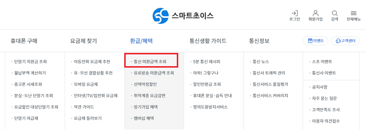 스마트 초이스로 이동하여 메뉴에서 환급/혜택을 클릭하신후 통신 미환급액 조회 메뉴를 선택합니다.