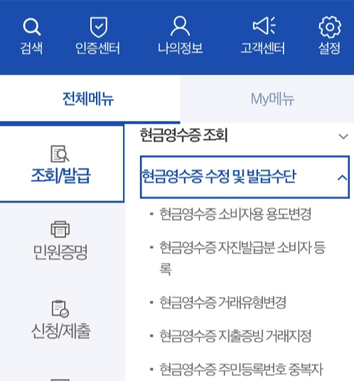 2. 조회발급 메뉴에서 > 현금영수증 수정 및 발급수단을 클릭합니다.