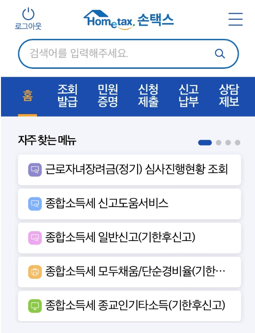 1. 손택스 앱 설치 후 메인화면에 접속합니다.