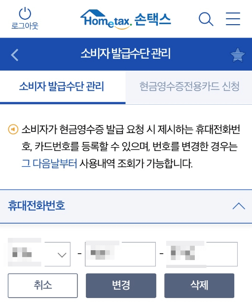 - 현금영수증 발급 시 사용한 번호와 동일한 휴대전화 번호를 입력해야 합니다.