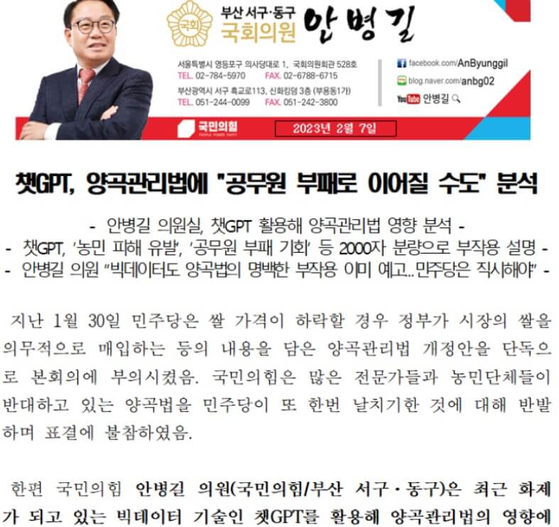 안병길의원은 ChatGPT를 활용해서 더불어민주당이 본회의의 단독 부의한 양곡관리법의 영향에 대해 부석한 결과라며 보도자료를 냈습니다.