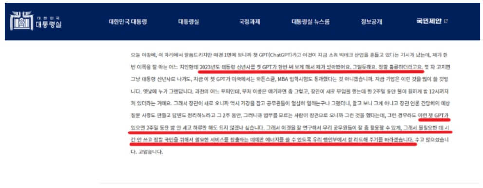 지난 27일 통일부,행정안전부,국가보훈처, 인사혁신처 업무보고서에서 행안부에 "ChatGPT를 잘 연구해서 우리 공무원들이 잘 활용할 수 있게, 그래서 불필요한데 시간 안쓰고 정말 국민을 위해서 필요한 서비스를 창출하는데에만 에너지를 쓸수 있도록 행안부에서 잘 주도해주길 바란다"고 당부했습니다. ChatGPT로 작성한 신년사를 받아봤다며 극찬하기도 했습니다.