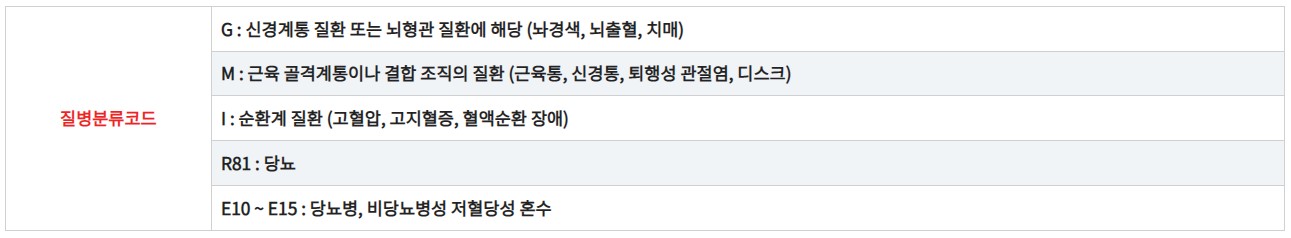 1. 본인이 이용하는 병원에 가셔서 질병코드 [신경계 - G코드, 근골격계 - M코드, 신경계질환(고혈압) - I코드, 당뇨질병 -R81, E10 ~ 15 코드]가 포함된 진단서, 소견서, 처방전 중 1가지가 기재되어 있는 서류를 준비합니다.